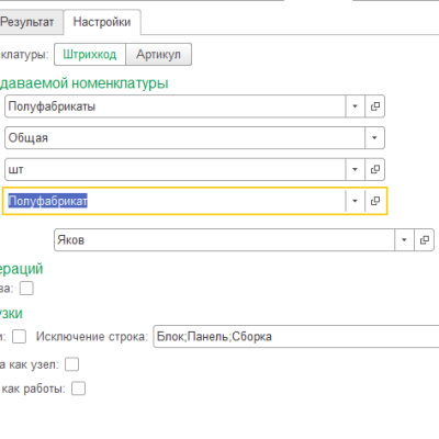 В «Настройках» указывается папка, где будут создаваться полуфабрикаты (при необходимости), например «Панель 714х376», необходимость использования ставки НДС, единицу измерения которая будет установлена деталям (шт.), категорию УНФ, указать каким образом сопоставлять материалы (штрихкод/артикул/вручную/дополнительный реквизит).