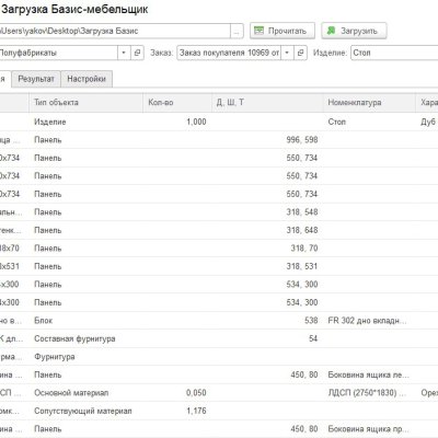 Первоначально необходимо выполнить команду «Прочитать», чтобы выполнить чтение XML файлов (предусмотрена возможность чтения состава сразу нескольких изделий), после чтения можно визуально наблюдать структуру изделия, так как она была разработана в Базис-мебельщик (на закладке «Структура изделия»), и одновременно можно наблюдать структуру изделия, так как предполагается к загрузке (закладка «Результат»). На этой закладке также можно определить сопоставления с номенклатурой 1С, если уже позиции присутствуют в базе, в случаях отсутствия сопоставлений, позиции будут созданы автоматически.