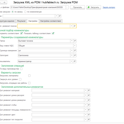 В «Настройках» указывается папка, где будут создаваться полуфабрикаты (при необходимости), необходимость использования ставки НДС, единицу измерения которая будет установлена деталям и сборочным единицам (например шт.), категорию УНФ (присутствует возможность изменения этих данных по каждой номенклатуре).